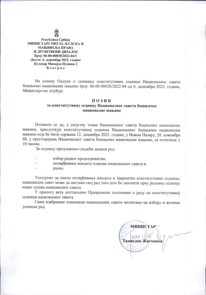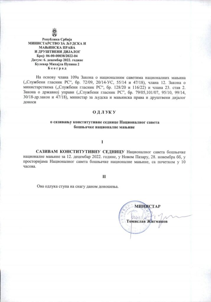 Srbijanski ministar za ljudska i manjinska prava i društveni dijalog, Tomislav Žigmanov donio je odluku da se konstitutivna sjednica novog saziva Bošnjačkog nacionalnog vijeća (BNV) održi u ponedjeljak, 12. decembra sa početkom u 10 sati.